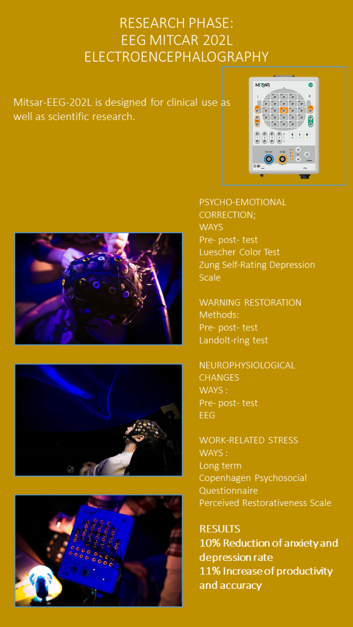 A kísérletek egy relaxációs szoba prototípusán belüli ötperces bemutató után az emberi állapot megváltoztatására irányult (gömb alakú képernyő került beépítésre). A kísérlet eredményei szerint a szorongás 10%-kal csökkent, p=0,88, a sebesség és a pontosság 15%-kal javult a tesztfeladat végrehajtásával, p=0,80. A kísérletben 31 fő (a szorongásszint felmérése Luscher színteszttel és Zung skálával) és 30 résztvevő (a sebesség és a pontosság értékelése Landolt gyűrűvel) vett részt.